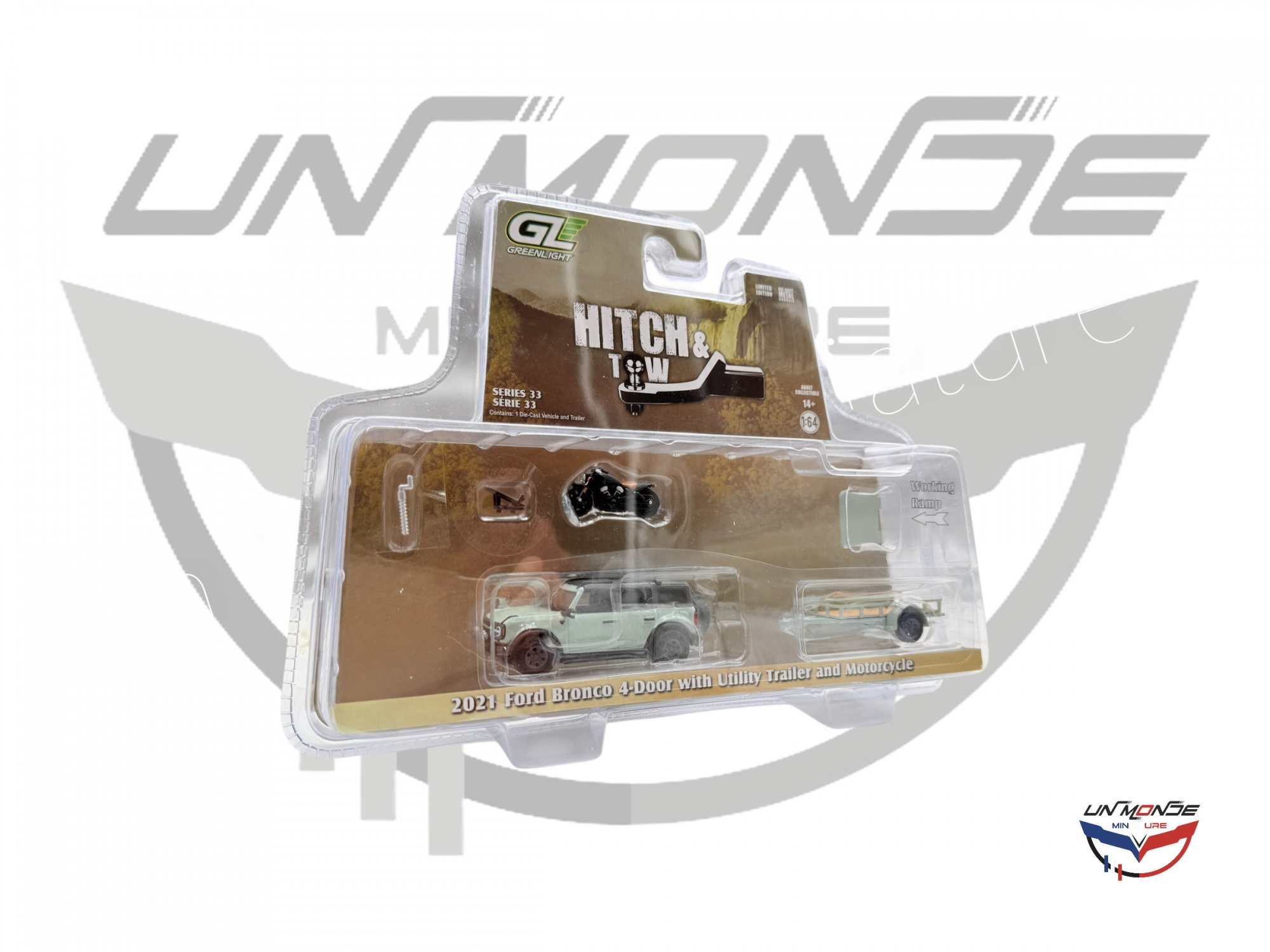 Accueil > Vehicules Miniatures > Véhicules 1:64 3 Inch > Ford Bronco 4-Door With Utility Trailer and Motorcycle