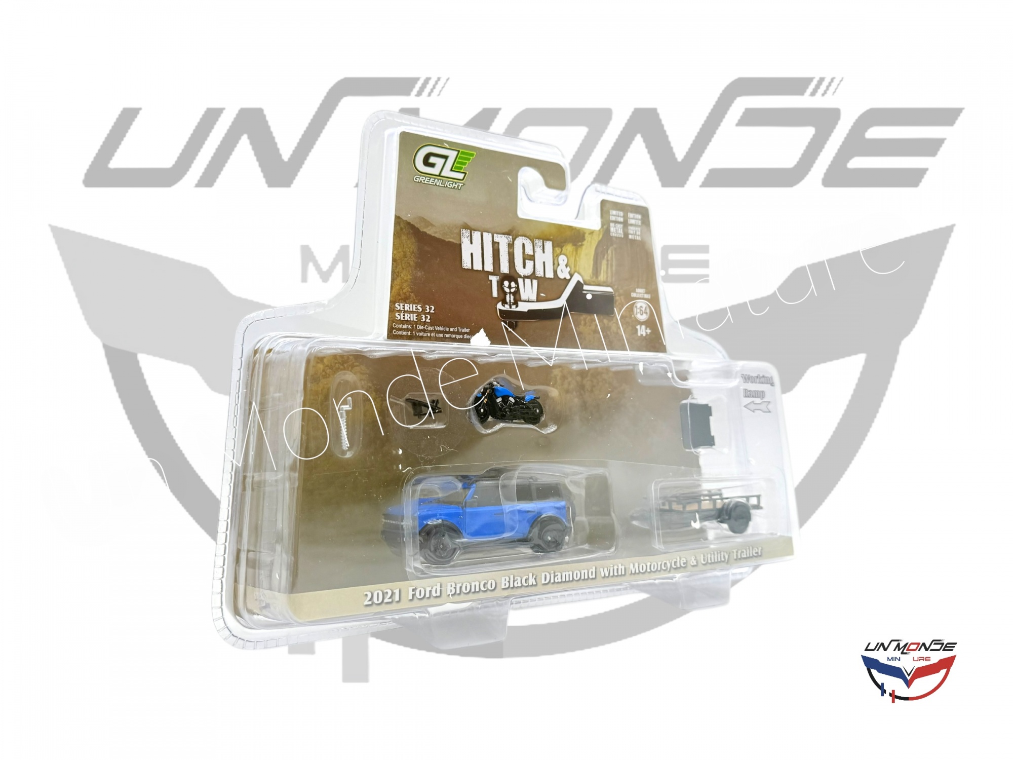 Accueil > Vehicules Miniatures > Véhicules 1:64 3 Inch > Ford Bronco Black Diamond With Motorcycle & Utility Trailer
